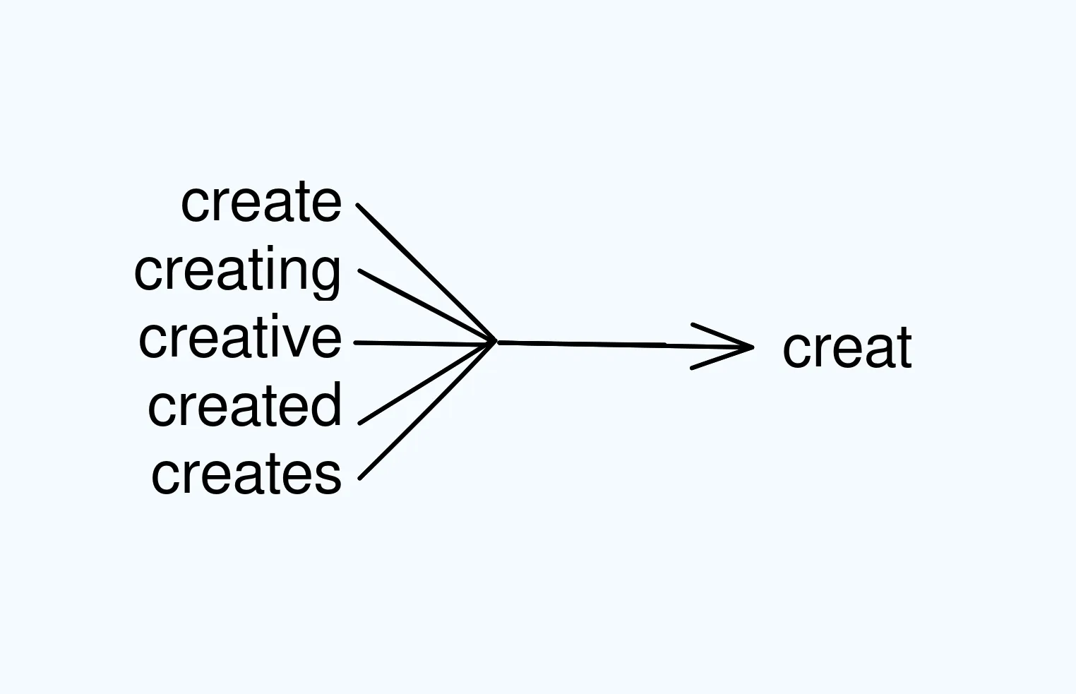 Let me give you an example with the word âcreate.â When we use word stemming, it transforms âcreateâ into its basic form, which is âcreatâ